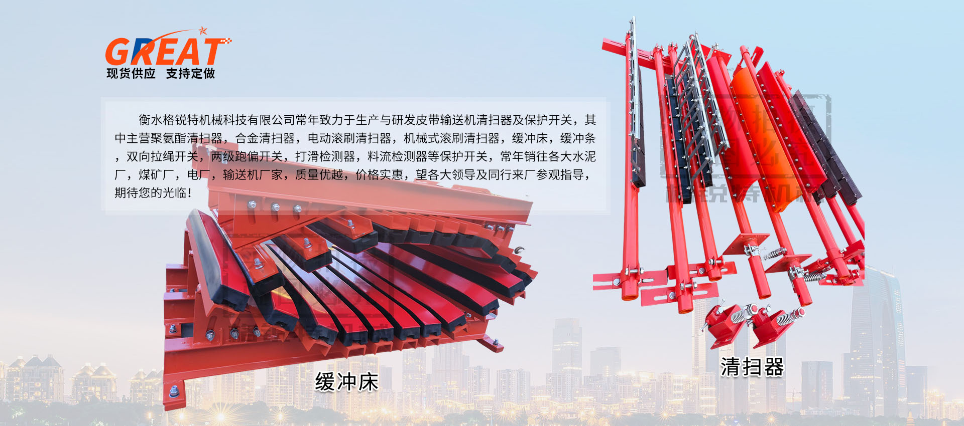 衡水格銳特機(jī)械科技有限公司常年致力于生產(chǎn)與研發(fā)皮帶輸送機(jī)清掃器及保護(hù)開關(guān),其中主營(yíng)聚氨酯清掃器,合金清掃器,電動(dòng)滾刷清掃器,機(jī)械式滾刷清掃器,緩沖床,緩沖條,雙向拉繩開關(guān),兩級(jí)跑偏開關(guān),打滑檢測(cè)器,料流檢測(cè)器等保護(hù)開關(guān),常年銷往各大水泥廠,煤礦廠,電廠,輸送機(jī)廠家,質(zhì)量?jī)?yōu)越,價(jià)格實(shí)惠,望各大領(lǐng)導(dǎo)及同行來(lái)廠參觀指導(dǎo),期待您的光臨!!!